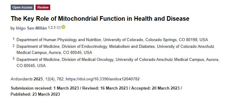 San-Millán I. The Key Role of Mitochondrial Function in Health and Disease. Antioxidants (Basel). 2023;12(4):782. Published 2023 Mar 23. doi:10.3390/antiox12040782